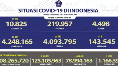 Selanjutnya, Satgas Covid-19 menyebutkan, jumlah kasus aktif terus menurun. Pada Minggu, kasus aktif turun sebanyak 154 kasus di seluruh Indonesia menjadikan total keseluruhan kasus tersisa 10.825 kasus.