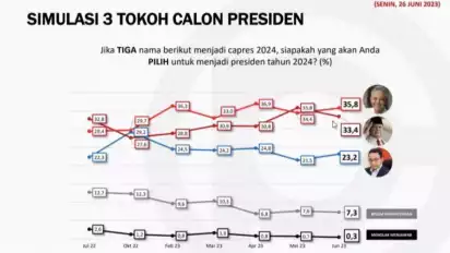 Hal tersebut merupakan hasil survei terbaru Lembaga Public Opinion and Policy Research (Populi) Center. Simulasi pemilihan presiden yang digelar saat survei pada 5–12 Juni 2023 menunjukkan Ganjar Pranowo memperoleh suara 35,8 persen suara dari total 1.200 responden, sementara Prabowo Subianto 33,4 persen, dan Anies Baswedan 23,2 persen.