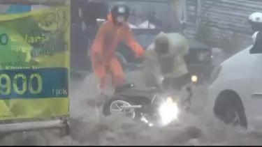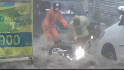Untuk menyelamatkan kendaraan yang terseret arus banjir, warga pun bahu membahu menyelamatkan motor tersebut. Beruntung, pengendara motor dapat menyelamatkan diri dari arus deras banjir.
