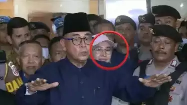 Kedua kalinya wanita berkerudung itu terlihat setia mendampingi Panji Gumilang kala menghadiri panggilan Bareskrim Polri pada Senin (3/7/2023).