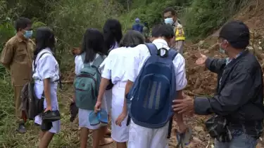 Tana Toraja, Sulawesi Selatan -- Demi belajar, puluhan anak sekolah di Dusun Buttu, Lembang Randanbatu, Kecamatan Makale Selatan, Kabupaten Tana Toraja, Provinsi Sulawesi Selatan, Selasa pagi 16/11/2021 menerobos longsor yang penuh dengan lumpur dan batang pohon.