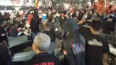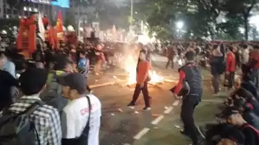 Kian Memanas! Massa Demo Buruh di Patung Kuda Rusak Pagar Berduri dan Lempar Botol