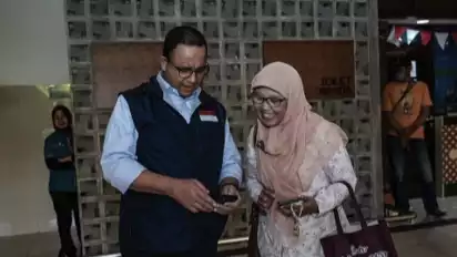 Anies yang sedang keluar dari pintu kedatangan tiba-tiba dihampiri oleh seorang ibu-ibu berkerudung cokelat muda.