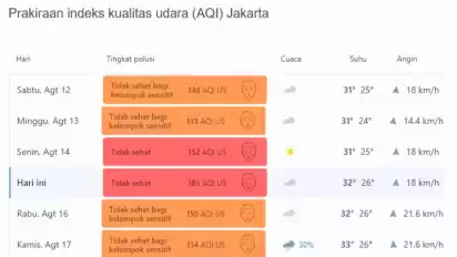 Kualitas udara hari ini membuat Jakarta, menjadi kota yang menempati urutan pertama kota yang memiliki udara tidak sehat, yang kemudian disusul Dubai, Uni Emirat Arab dengan polusi udara mencapai 173.