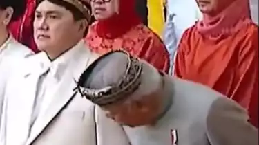 Menteri PUPR terlihat mengamati jas beskap yang dikenakan Erick terutama di bagian perut selama beberapa detik.