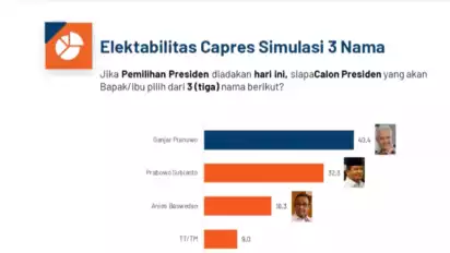 Ganjar Pranowo meraih elektabilitas sebesar 40,4 persen, disusul Prabowo Subianto sebesar 32,3 persen, dan Anies Baswedan sebesar 18,3 persen.
