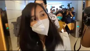 Pemeran wanita film dewasa itu tiba dengan berlari mencoba menghindari awak media yang telah menunggunya.