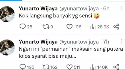 "Ngeri ini permainan maksain sang putera lolos syarat bisa maju," cuit Yunarto, dikutip dari @yunartowijaya.