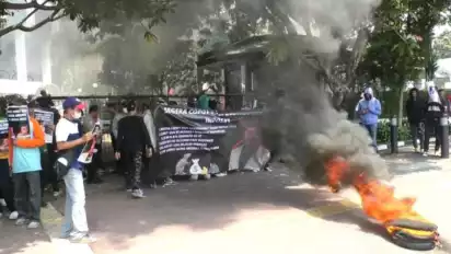 Mereka melakukan unjuk rasa sambil bakar ban terkait kasus korupsi Bakti BTS Kominfo Johnny G Plate Cs.