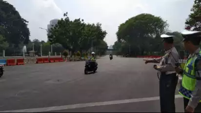 Jakarta - Petugas Satuan Lalu Lintas Polres Metro Jakarta Pusat merekayasa arus lalu lintas kendaraan yang mengarah ke Istana Negara, Jalan Merdeka Utara, Jakarta Pusat, karena aksi buruh menyampaikan pendapat di muka umum pada Kamis.