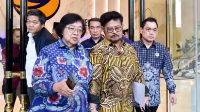 Diketahui, SYL dan Siti Nurbaya sambangi markas NasDem untuk menemui Ketua Umum Surya Paloh di lantai atas. Keduanya kemudian turun ke lobi untuk menemui wartawan.