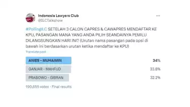 Hasilnya dari 190.655 netizen, 34% netizen yang melakukan polling di akun Tiwtter ILC menyatakan dukungan kepada Anies - Muhaimin. 33,8% netizen menjatuhkan pilihannya ke pasangan Ganjar - Mahfud. Terakhir, sebanyak 32,2% netizen memilih pasangan Prabowo - Gibran.