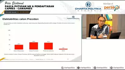 Jakarta, tvOnenews.com - Charta Politika merilis survei peta elektoral pasca putusan Mahkamah Konstitusi (MK) dan pendaftaran Capres-Cawapres 2024. Salah satu hasilnya menunjukkan elektabilitas pasangan Ganjar-Mahfud unggul dari Prabowo-Gibran dan Anies-Muhaimin dalam simulasi 3 nama.