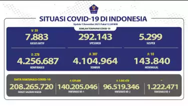 Jakarta - Pasien Covid-19 di Indonesia mengalami penambahan sebanyak 278 orang pada awal Desember 2021, membuat saat ini terdapat 7.883 kasus aktif atau pasien yang tengah menjalani perawatan setelah terkonfirmasi positif terjangkit penyakit tersebut.