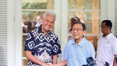 Jakarta, tvOnenews.com - Calon presiden (capres) nomor urut 3 Ganjar Pranowo menyambangi kediaman Wakil Presiden (Wapres) ke-11 RI Boediono di kawasan Menteng, Jakarta Pusat, pada Jumat (24/11/2023).