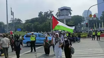 Mereka mengenakan atribut seperti bendera Palestina hingga papan bertuliskan doa untuk Palestina.