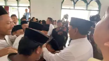 Para santri putra mulai mengerubungi Prabowo ketika dia akan meninggalkan masjid yang terletak di dalam Ponpes itu.