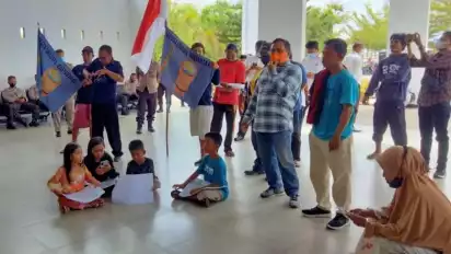 Didampingi orang tua dan pemerhati pendidikan Kota Palopo, para siswa ini duduk melantai depan kantor DPRD sambil membentangkan spanduk bertuliskan protes mereka.