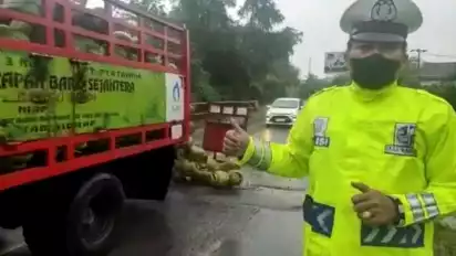 Dalam video lain kedua polantas tersebut terlihat bersama warga membantu supir truk memungut puluhan tabung yang berhamburan ke jalan.