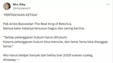 “Pak Anies Baswedan The Real King of Retorica. Semua kata-kata tersusun bagus dan sering berima. ‘Setiap pelanggaran hukum harus dihukum. Karena pelanggaran hukum bisa menular, dan lama-lama bisa dianggap benar’,” tulis Kiky Saputri di X, dikutip pada Rabu, (13/12/2023).
