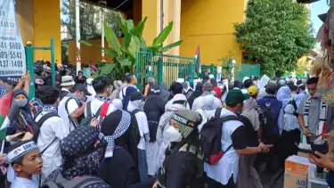 Tidak hanya itu, massa yang hadir pun tampak membawa sejumlah atribut seperti poster, syal hingga bendera Palestina.