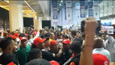 Saat itu pula massa pendukung dari kubu paslon nomor urut 3 Ganjar Pranowo - Mahfud MD, dan Paslon nomor urut 2 Prabowo Subianto - Gibran Rakabuming Raka nyaris bentrok di Exhibition Hall A JCC Senayan.