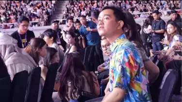 Gibran tampak menyaksikan sejumlah penampilan dari grup musik yang tampil dalam acara tersebut. Gibran tampak memperhatikan setiap penampil.