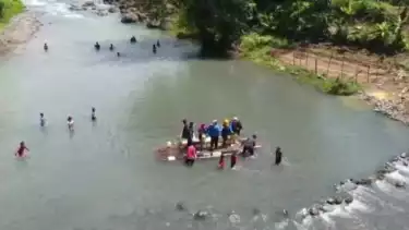 Petugas tenaga kesehatan harus berjalan kaki dan menyebrangi sungai dengan rakit bambu. Akses menuju dua desa itu tidak bisa dilalui lagi dengan kendaraan karena jembatan Cimangke yang dulunya untuk dilalui kendaraan bermotor putus diterjang banjir bandang.