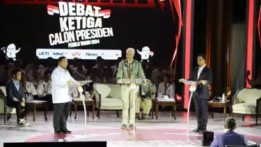 Ketiga capres 2024 dalam debat capres ketiga di Istora Senayan, Jakarta, Minggu (07/1/2024). (tvOnenews/Muhammad Bagas)