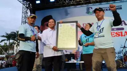 Pada momen itu, Prabowo yang sedang berpidato, tiba-tiba meminta izin bertanya kepada mereka.Â