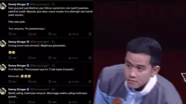 Pegiat media sosial, Denny Siregar turut mengomentari gesture 'mencari-cari jawaban' dari Gibran Rakabuming Raka yang ditujukannya kepada Mahfud MD.