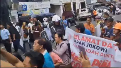 Namun spanduk tersebut langsung direbut oleh dua orang pria yang diduga tim keamanan dan membawanya pergi menjauh dari mobil Presiden Jokowi.