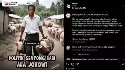 Jakarta, tvOnenews.com - Mencengangkan netizen unggahan media sosial instgram Bem Seluruh Indonesia. Pasalnya, akun tersebut mengunggah foto Jokowi sambil membawa babi di dalam gentong yang bertuliskan bansos.