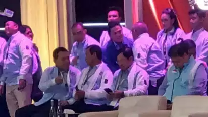 Lalu, di barisan itu turut hadir Menteri komunikasi dan Informatika, Budi Arie Setiadi, Menteri BUMN, Erick Thohir, dan Gubernur Jawa Timur, Khofifah Indar Parawansa.