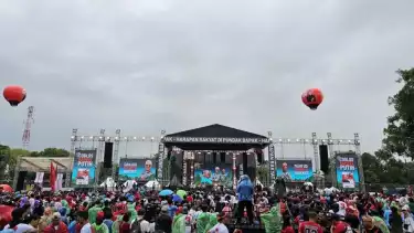 Solo, tvOnenews.com - Hujan mengguyur lokasi kampanye akbar paslon nomor urut 3, yakni acara Hajatan Rakyat di Benteng Vastenburg, Kota Solo, Jawa Tengah, Sabtu (10/2/2024).