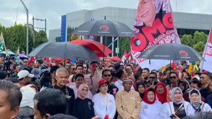 Ganjar dan Mahfud menyaksikan bersama istrinya masing-masing di tengah rintik hujan. Ketua DPP PDIP Puan Maharani juga ikut menyaksikan pertunjukan wayang orang itu.