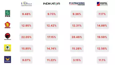 Sementara berdasarkan Voxpol Center Research & Consulting menunjukkan Gerindra meraih suara 14.88 persen.