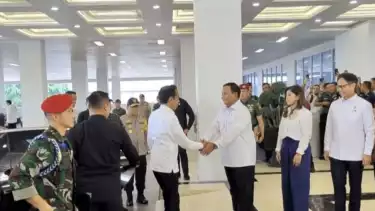 Jakarta, tvOnenews.com - Menteri Pertahanan (Menhan) Prabowo Subianto menyambut kedatangan Presiden RI Joko Widodo (Jokowi) menjelang peresmian Rumah Sakit Pusat Pertahanan Negara (RSPPN) Panglima Besar Soedirman di Bintaro, Senin (19/2/2024).