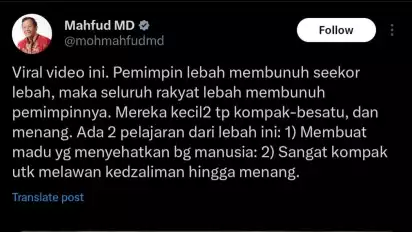 "Viral video ini. Pemimpin lebah membunuh seekor lebah, maka seluruh rakyat lebah membunuh pemimpinnya. Mereka kecil2 tp kompak-besatu, dan menang," ucap Mahfud di akun X-nya dikutip, Sabtu (24/2/2024).
