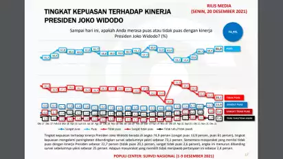 "Tingkat kepuasan terhadap kinerja Presiden Joko Widodo berada di angka 74,9 persen. Berdasarkan tren, angka kepuasan tersebut merupakan yang paling tinggi bila dibanding survei-survei bulan sebelumnya," kata Peneliti Populi Center, Rafif Pamenang Imawan.