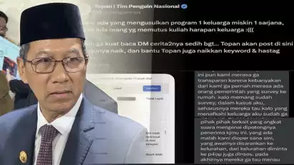 "Disaat ada yang mengusulkan program 1 keluarga miskin 1 sarjana, malah ada orang yg memutus kuliah harapan keluarga. Topan nggak kuat baca DM cerita-cerita sedih banget, Topan akan post di sini biar isunya naik, dan bantu Topan juga naikkan keyword dan hastag KJMU," tulisnya di media X, seperti yang dikutip pada Rabu (6/3/2024).