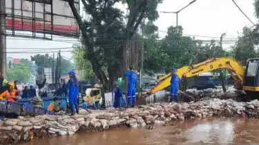 "Karung pasir ditata kembali untuk menahan aliran air yang melimpas ke Jalan Raya Bogor, sebagai penanganan awal," kata Wawan, Senin (25/3/2024).