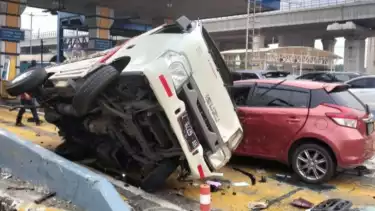 Belum jelas apa yang jadi penyebab, sopir truk malah tancap gas dan menabrak kendaraan lain yang mengantre di gerbang tol.