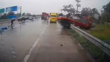 Terlihat sebuah truk berwarna merah mengalami hilang kendali saat melaju dengan kecepatan tinggi.