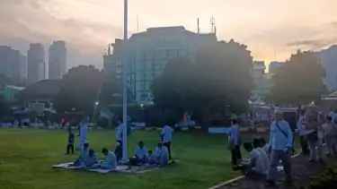Sejumlah masyarakat mulai berdatangan ke Masjid Al-Azhar sejak pukul 5.30 WIB. Mereka langsung mengambil posisi salat sebagaimana telah dipersiapkan oleh pihak Masjid Al-Azhar, yakni jemaah laki-laki di lapangan hijau dan perempuan di bagian batas lapangan hijau hingga bagian pintu masuk masjid.