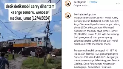 "Detik detik mobil carry dihantam KA Argo Semeru, Wonoasri, Madiun, Jumat (12/4/2024)," caption yang ditulis @beritajtim tersebut.