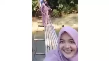 Berdasarkan video viral yang beredar, tampak warga perempuan merekam dirinya menggunakan handphone saat menyebrang jembatan gantung tersebut.