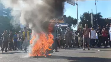 Jakarta, tvOnenews.com - Massa yang menggelar aksi terkait putusan MK di bundaran patung kuda, Monas, Jakarta Pusat, Senin (22/4/2024), melakukan aksi bakar ban.