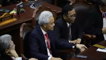 Paslon nomor urut 03 Ganjar Pranowo-Mahfud Md di sidang putusan sengketa Pilpres, di Gedung MK, Jakarta Pusat, Senin (22/4/2024). (tvOnenews.com/Muhammad Bagas)