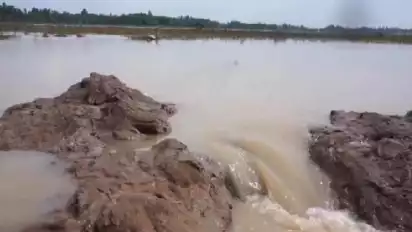 Lampung Selatan, Lampung - Akibat diguyur hujan deras dalam sepekan terakhir, tanggul penahan air di Desa Sinar Pasemah, Kecamatan Candipuro, Kabupaten Lampung Selatan, Lampung, jebol hingga merendam ratusan hektare areal persawahan.